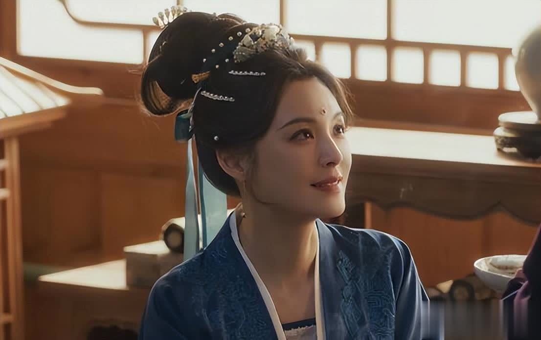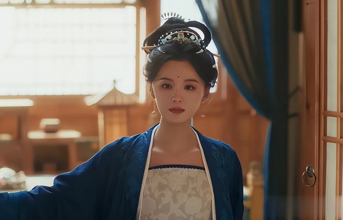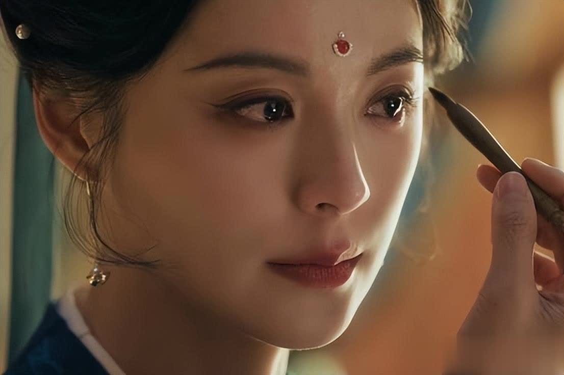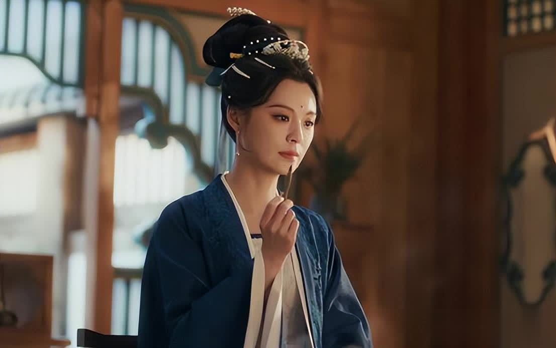 她簪着华丽的珠钗,深蓝、月白色锦缎长裙上绣着暗纹,雍容华贵,额头上的红色花钿衬得她更加明艳动人。